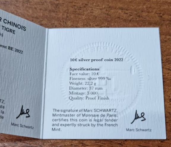 Описание Франция 10 евро "Китайский гороскоп. Год Тигра" 2022 год Proof