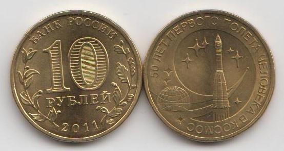 Россия 10 рублей "50 лет первого полета человека в космос" 2011 год UNC