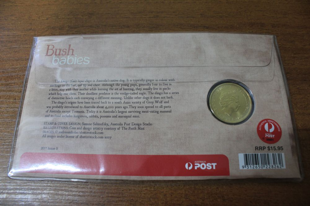 Описание Австралия Комплект марка + 1 доллар "Детеныши диких животных. Динго. Bush Babies" 2011 год UNC
