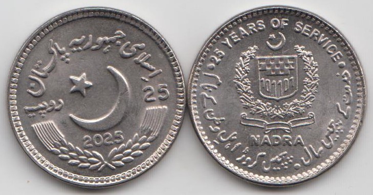 Описание Пакистан 25 рупий "25 лет Национальной базе данных и Регистрационного органа" 2025 год UNC