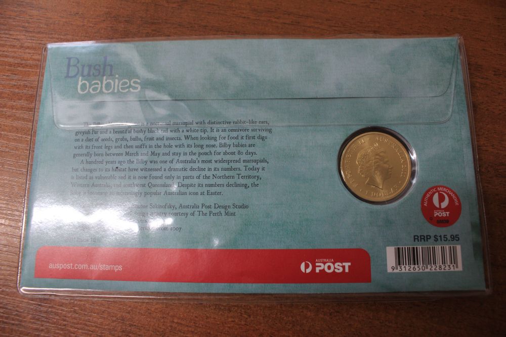 Описание Австралия Комплект марка + 1 доллар "Детеныши диких животных. Кроличий бандикут. Bush Babies" 2011 год UNC