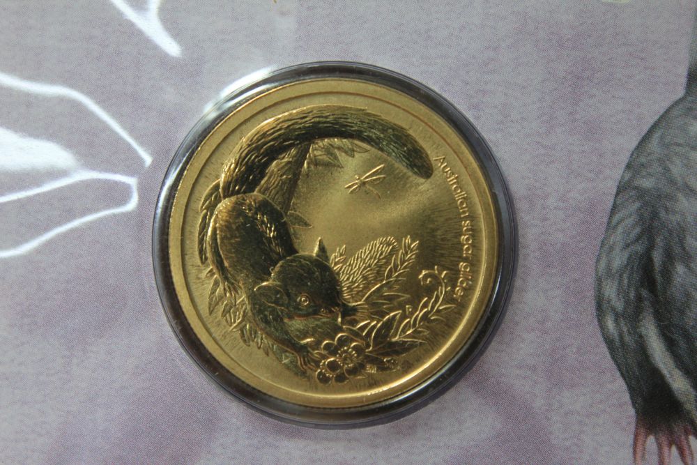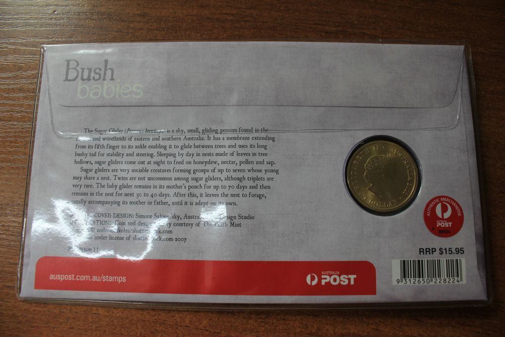 Описание Австралия Комплект марка + 1 доллар "Детеныши диких животных. Сахарная летяга. Bush Babies" 2011 год UNC