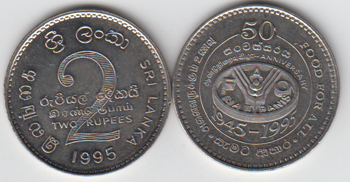 Описание Шри-Ланка 2 рупии "50 лет Продовольственной программе - ФАО" 1995 год UNC